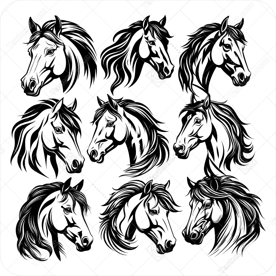 دانلود وکتور سر اسب (9 مدل) | EPS, CDR, PNG – مجموعه حرفه ای برای لیزر و چاپ