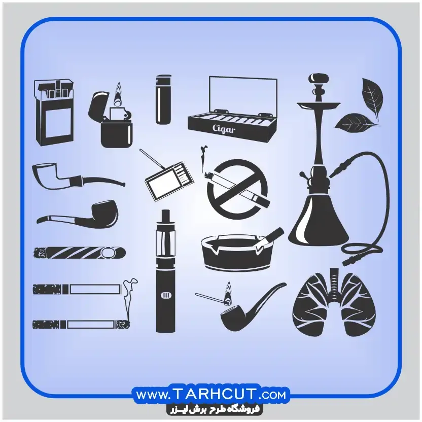 سیگار، قلیان، کبریت، فندک، برگ، زیر سیگاری، کبد، سیگار الکترونیک، سیگار در حال دود، پیپ، پاکت سیگار، جعبه سیگار،