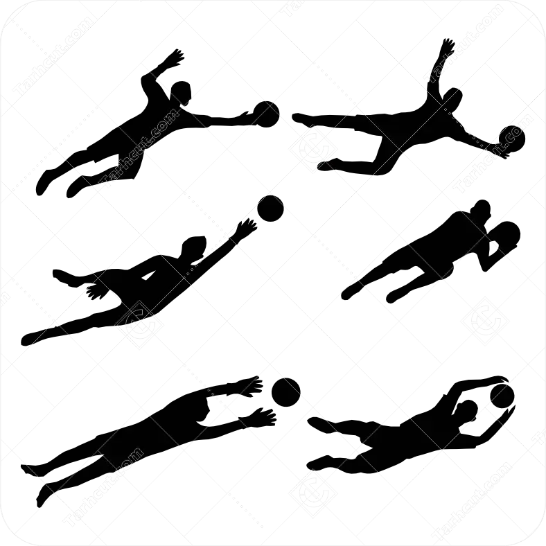 مجموعه شش عددی دروازه بان در حال گرفتن توپ به صورت سایه نما یا سیاه و سفید جهت طراحی ها و تندیس های ورزشی و فوتبالی جهت برش لیزر