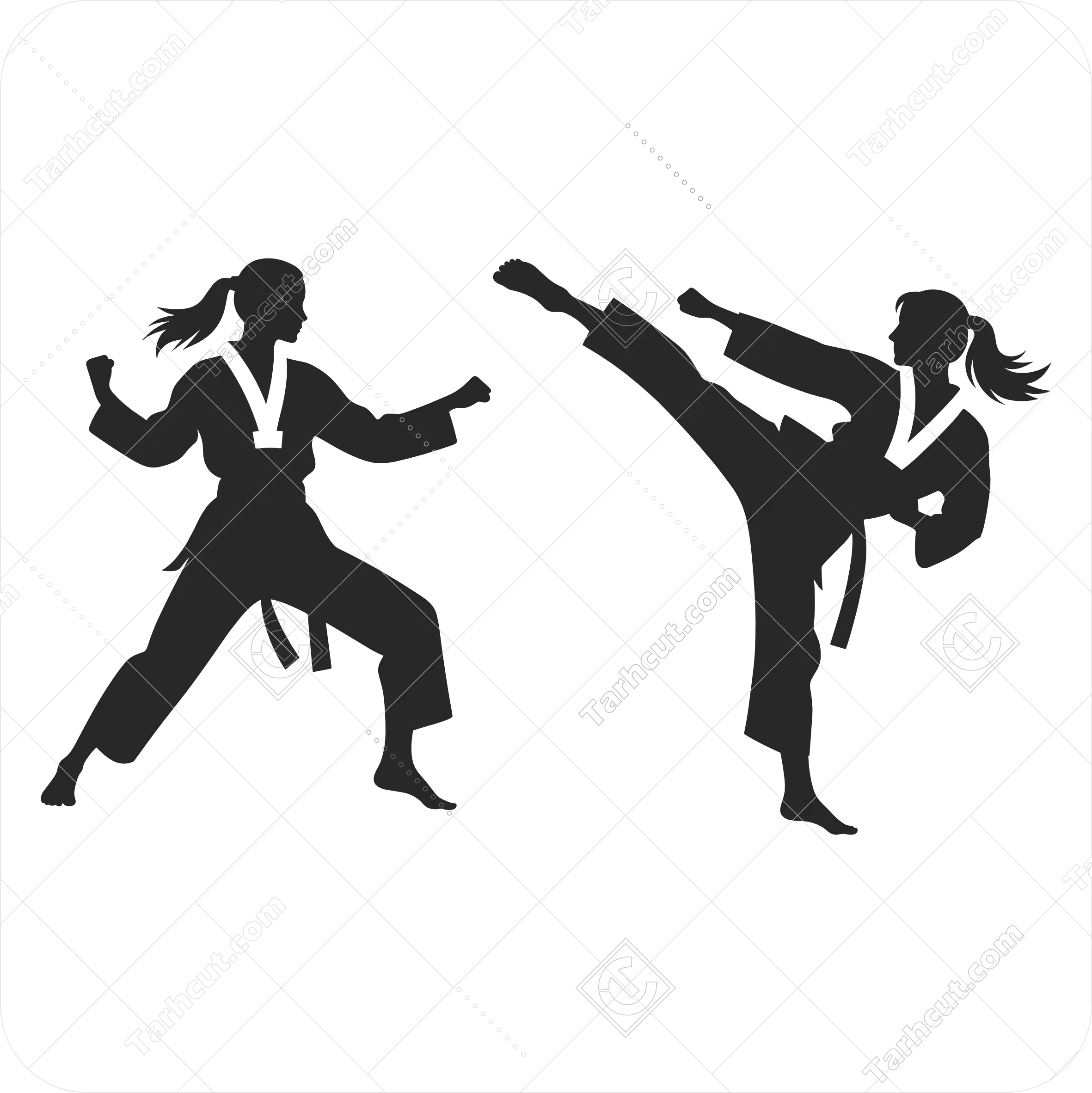 وکتور دو دختر تکواندو کار در حال مبارزه با کیفیت بالا و سیاه و سفید جهت استفاده در تندیس و برش لیزر