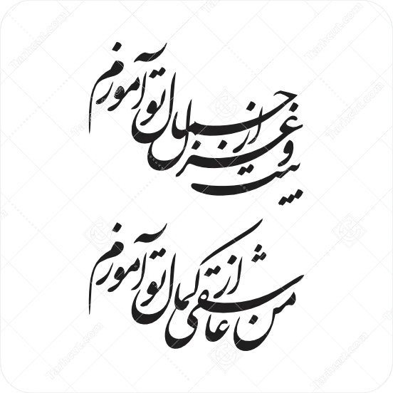 طرح وکتور خطاطی شکسته نستعلیق یا خوشنویسی ( کالیگرافی ) بیت(من عاشقی از کمال تو آموزم بیت و غزل از جمال تو آموزم خوشنویسی شکسته نستعلیق شعر از مولانا)که مورد استفاده آن جهت کارهای چاپی از جمله تیشرت لیوان ولوازم هنری و همچنین جهت برش و حکاکی محصولات لیزری و cnc استیکر های دیواری است را می توان بدون محدودیت در سایز از آن استفاده کرد. طرح وکتور خوشنویسی یا شکسته نستعلیق با پسوند های eps , cdr , png است تا بتوانید در نرم افزار های برداری از جمله کورل دراو باز کنید. در صورت نیاز داشتن به پسوند عکس با کیفیت بالا ،میتوانید طرح را درون نرم افزار کورل دراو یا نرم افزارهای برداری باز کنید و با کیفیت بالا خروجی عکس بگیرید. خوشنویسی هنر جاودانهٔ زیبانویسی است که با حرکات روان و حسابشدهٔ قلم، کلمات را به تصویر میکشد. از نستعلیق و شکسته تا کالیگرافی مدرن، هر خط بیانگر روح فرهنگ و هنر است. خطاطی تنها نوشتن نیست، بلکه آفرینش ترکیبی از نظم و هنر است که در طراحی لوگو، تزئینات و صنایع دستی جلوهای منحصربهفرد دارد